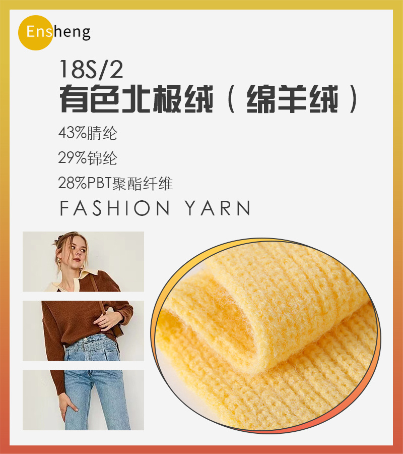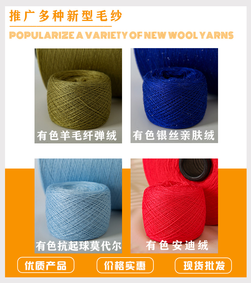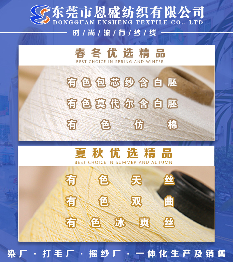 有色丝光棉,有色冰爽丝,有色仿亚麻,有色双曲,有色天丝,有色兔绒/高弹包芯纱,有色莫代尔包芯纱,有色安哥拉北极绒,有色羊毛纤弹绒,银丝亲肤绒,有色安迪绒,有色仿棉,半精梳棉纱,有色羊毛混纺,有色鹿毛绒,1.3公分不掉毛仿貂