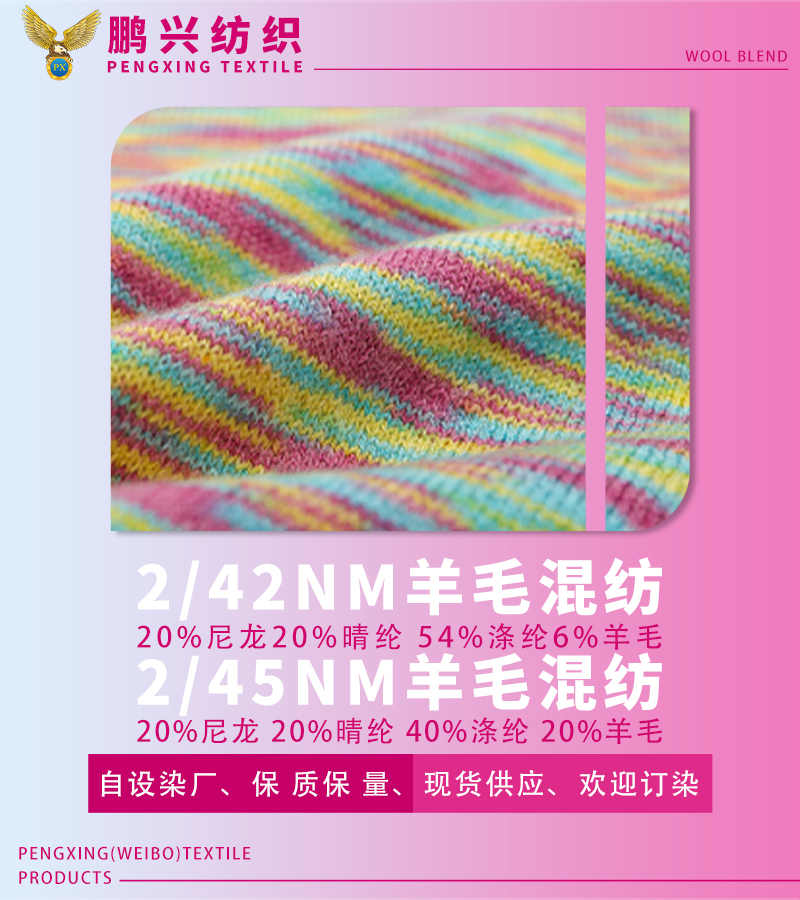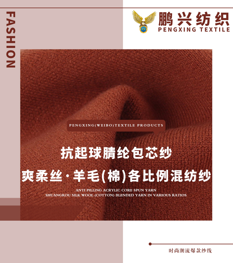 东莞市鹏兴纺织制品有限公司:玉蚕丝美丽奴羊毛混纺、蚕丝棉混纺纱、兔绒包芯纱、美丽奴丝光抗起球羊毛混纺、棉纱、羊毛混纺、晴棉、粘棉、包芯纱、天丝腈、高弹包芯纱、双曲(冰麻)、仿亚麻、丝光棉、抗起球腈纶包芯纱、1.3公分仿貂。