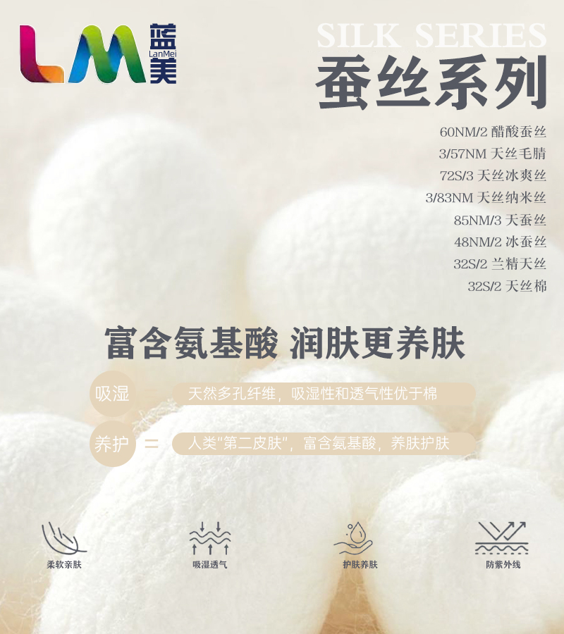 蓝美产品业务主要为一以羊绒羊毛为代表的色纺混纺类高端经典纱线;二以天丝、麻、棉等天然纤维为代表的新型纱线三以创新加工工艺的春夏潮流纱线;四以粗狂奔放、持点鲜明,辅以多种新型染色工艺的花式时尚纱线,为四大板块。