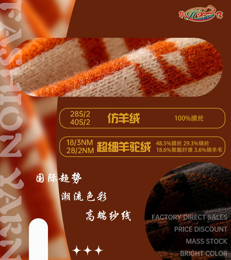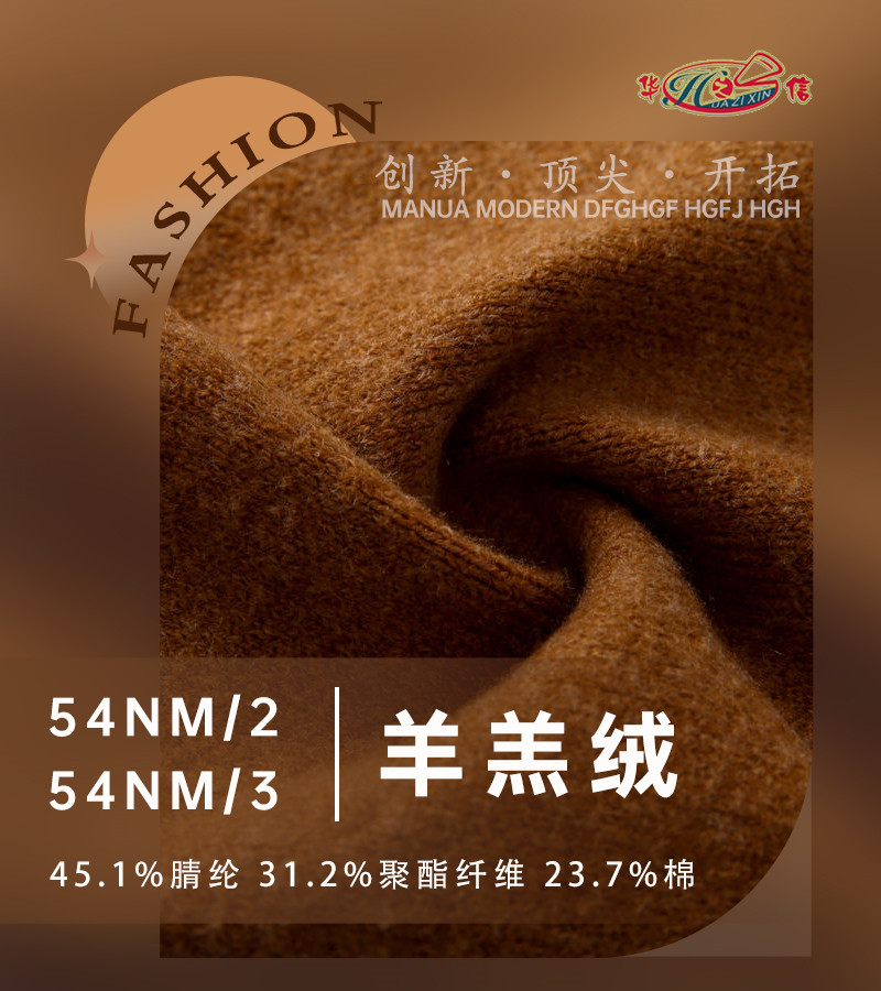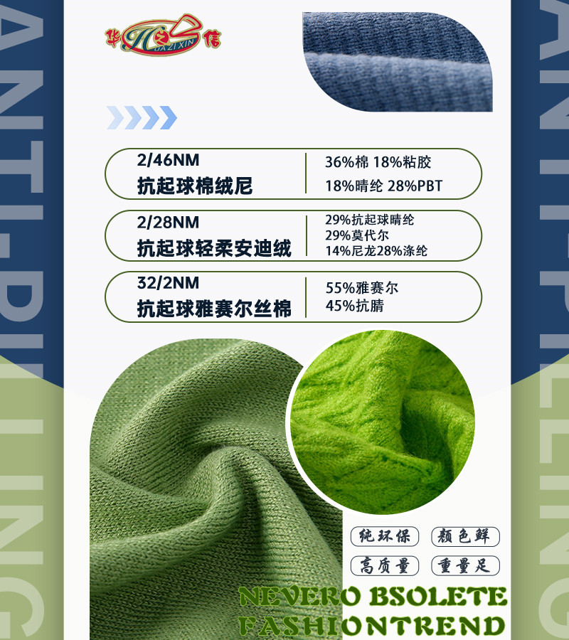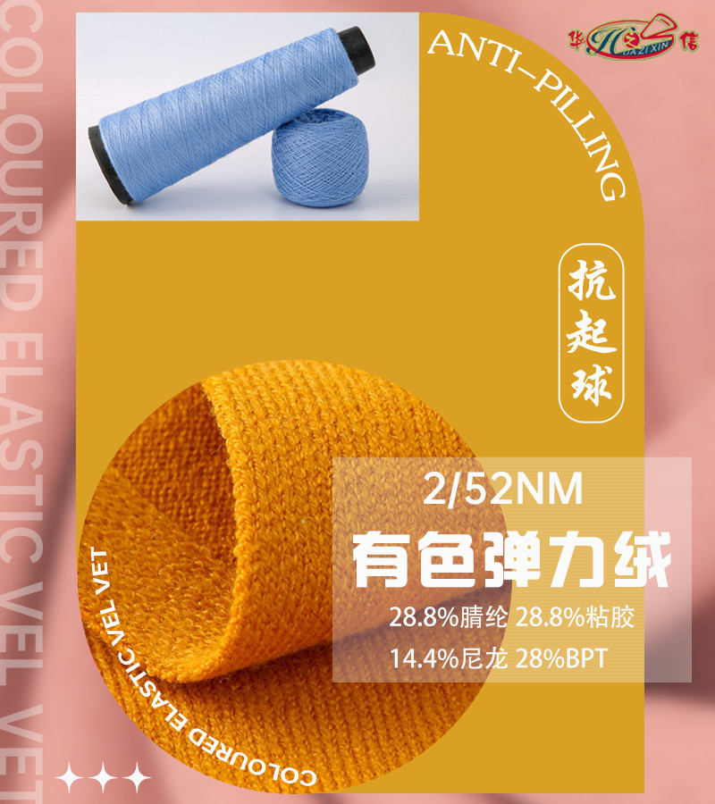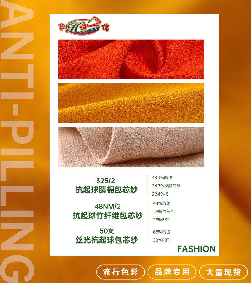 32/2抗起球雅赛尔丝棉、2/48抗起球竹纤维苞芯纱、2/46抗起球棉绒尼、2/50支丝光抗起球苞芯纱、2/52抗起球有色弹力绒、32/2腈棉苞芯纱、有色丝光棉、超弹力高弹丝、1/23亚麻尼龙、1/3N冰岛毛、1/13N马海毛、48S/2丝光假三七、3/57天丝晴、32S/2棉纱、2/28晴棉