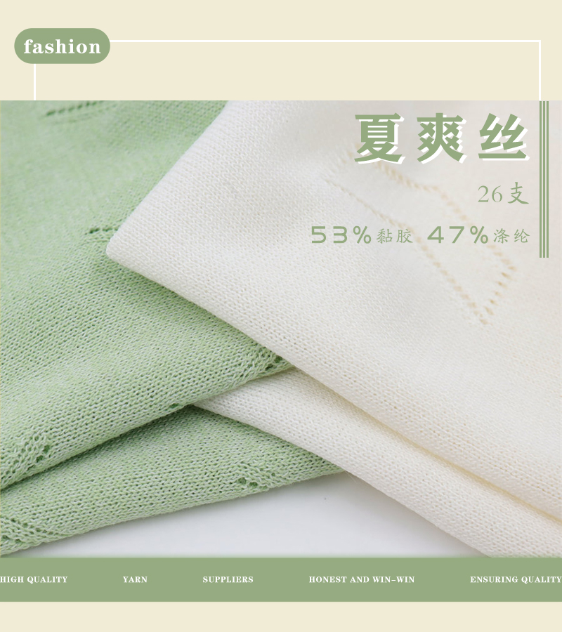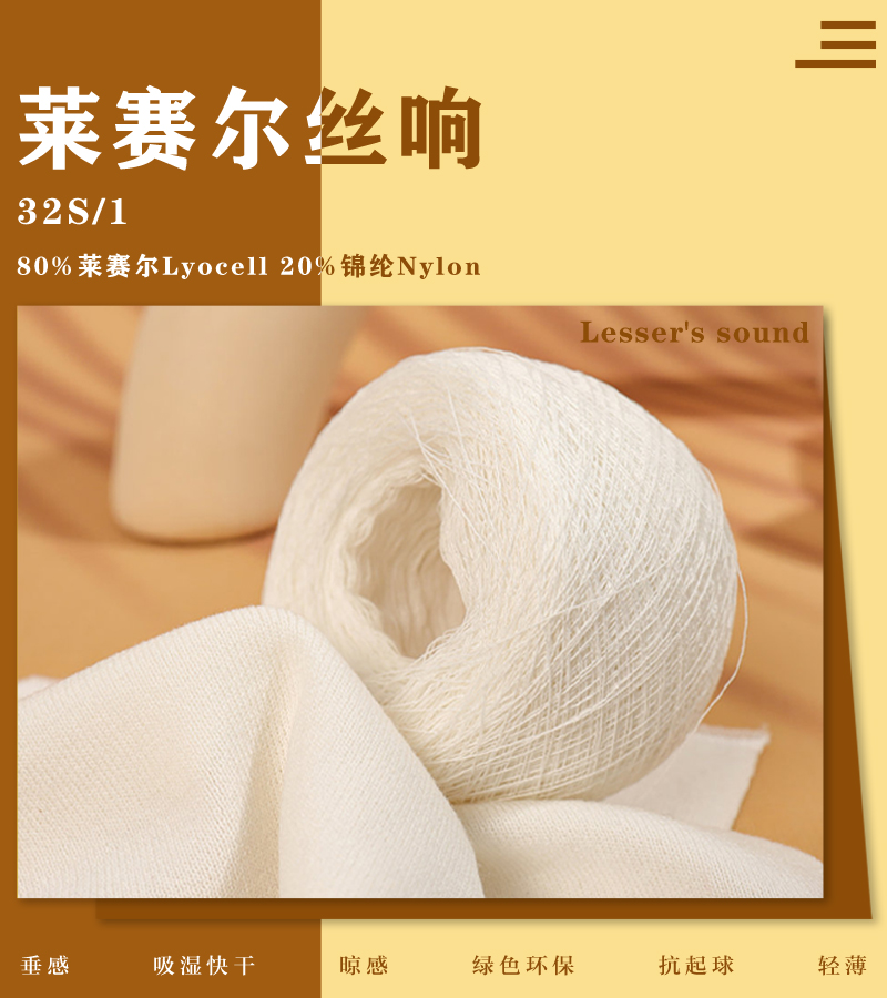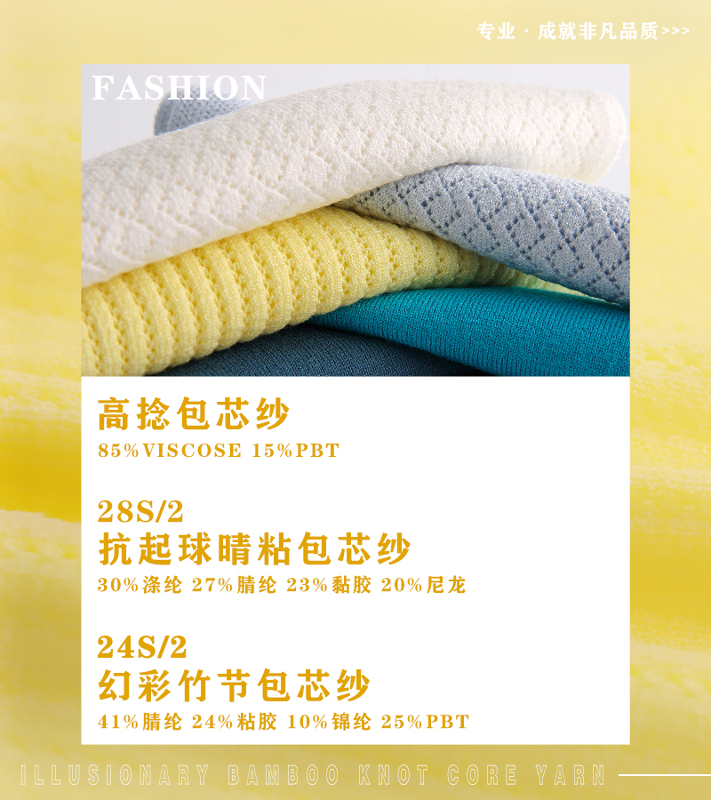 50nm/2无结头高捻包芯纱、28S/2抗起球睛粘包芯纱、 52NM/2艾草抗菌纱、24S/2幻彩竹节包芯纱、48NM/2抗菌无压羊毛、50NM/2弹力天丝棉(天丝包芯纱)、19S/1高捻银光丝、26S/2超细新型北极绒(绵羊绒)
