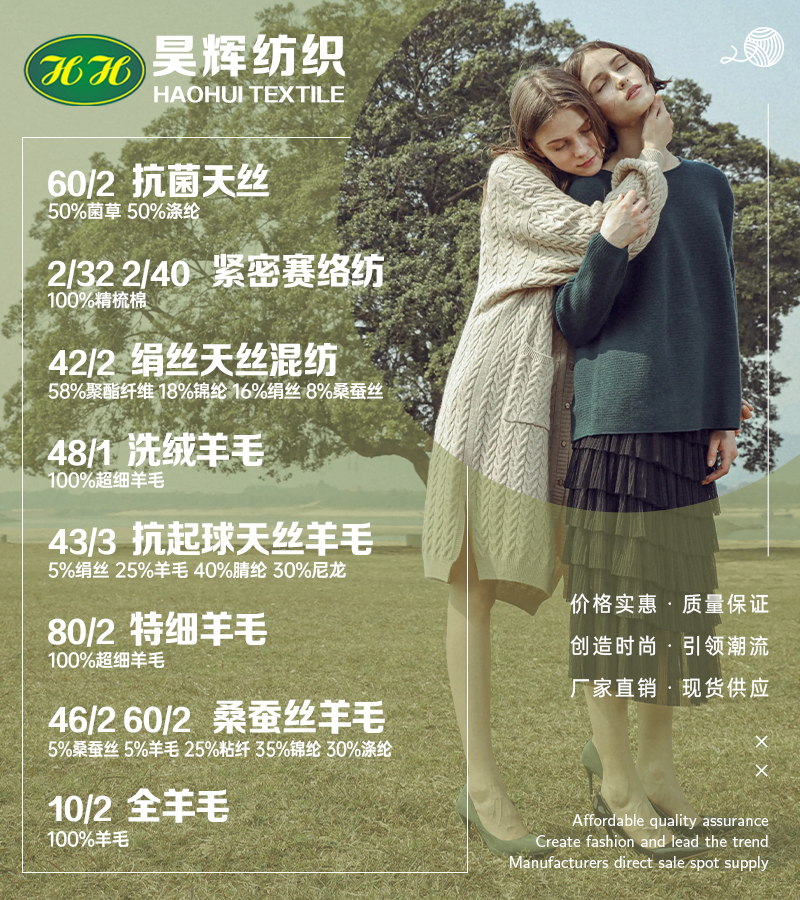 昊辉纺织经营部:亲肤双绒纱, 羊羔绒 , 竹晴(竹纤), 超细全羊毛, 45支羊毛混纺 , 山羊绒 , 绢丝天丝混纺 , 16支兔绒混纺, 16支高比例兔毛混纺, 粗旷驼毛, 多股柔软爽棉, 多股高(强)捻棉