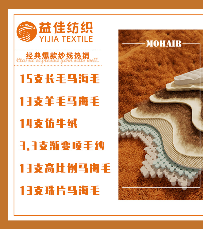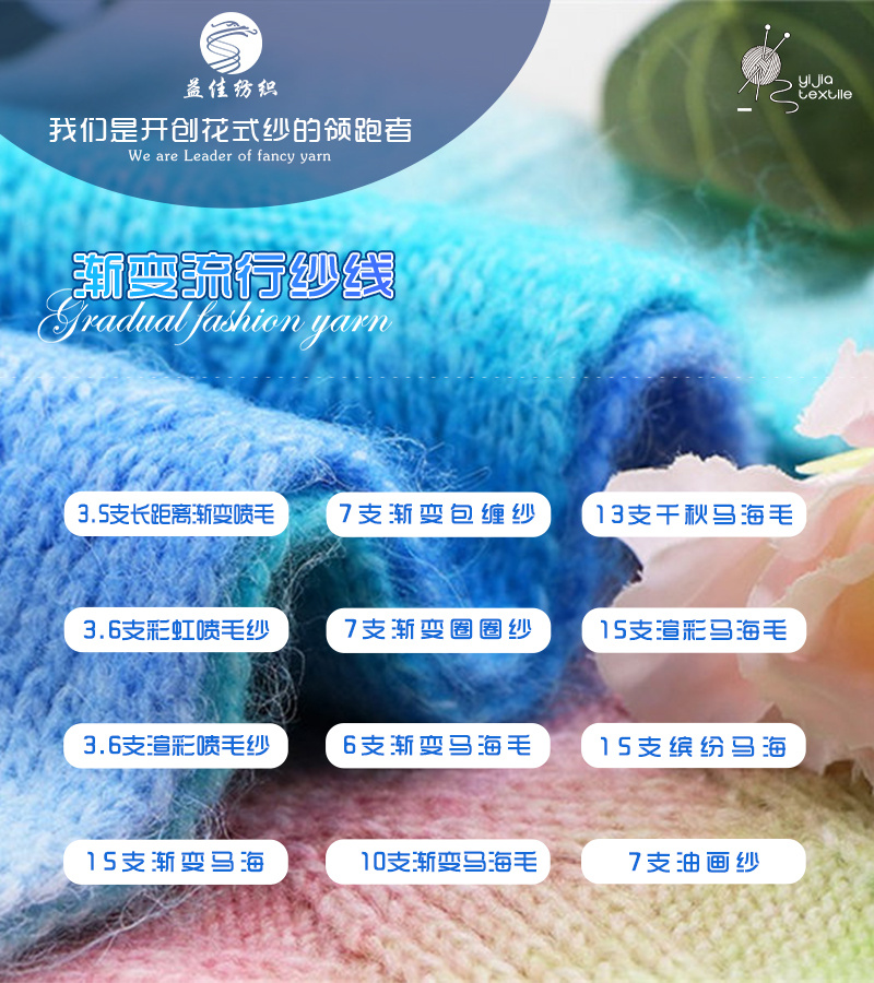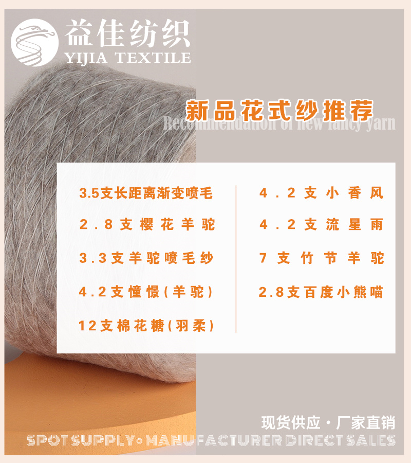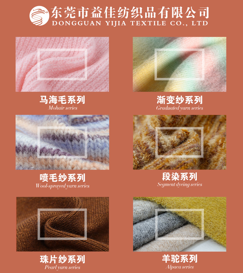 马海系列 渐变系列 羊驼系列,喷毛系列 珠片系列 圈圈纱 仿牛绒 包缠纱 以及各种花式纱