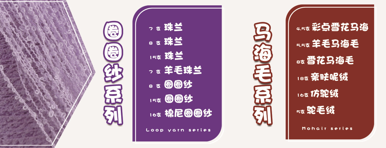 冰岛毛系列,圈圈纱系列,马海毛系列,小肚棉,大肚曲珠,羽毛纱,超细羽毛纱,二经一纬,冰岛纱,马海毛,冰曲,米粉纱,蜈蚣纱,松树纱,水结珠,克白水结珠,牙刷绒,牙刷纱,楼梯纱,弹力么唏,5公分仿水貂