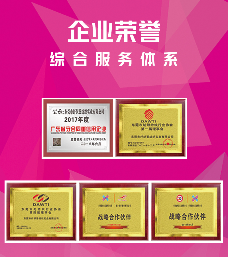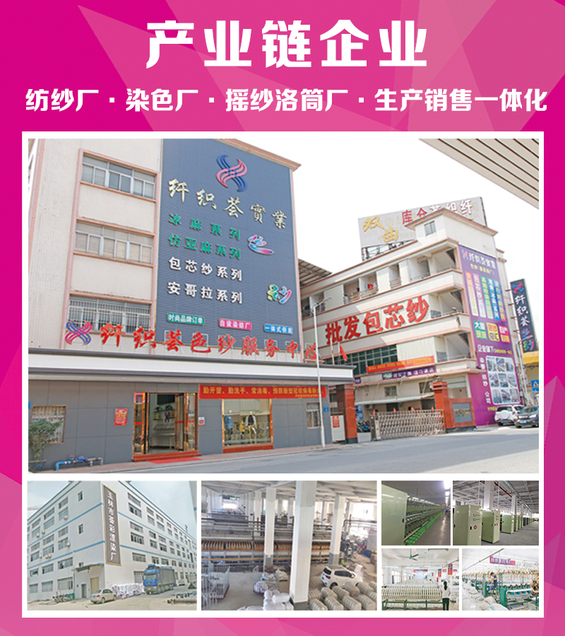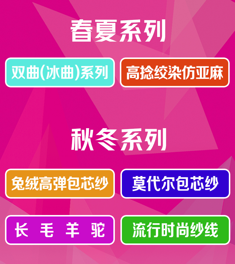 天爽亚麻,24S/30S无结双曲(冰麻),羊毛天丝,,长毛马海,高比例羊毛,无结包芯纱,抗起球北极绒,珠片北极绒,长毛羊驼,莫代尔,安迪绒,北极绒段彩系列,彩虹渐变系列等等。我们始终坚持以优质的产品、专业的服务满足客户的需求,致力于为毛织行业提供可靠的毛纱供应。