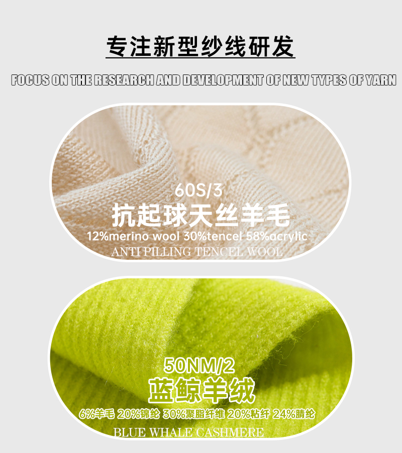 海岛棉、抗起球莫代尔包芯纱、弹力绒、超柔小尼绒、超柔天丝绒、梦幻圈圈纱、抗起球丝光天丝、天鹅绒(蜈蚣纱)、亲肤丝光9羊毛、毛呢绒、新型色纺纤绒纱