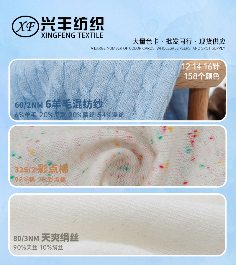 32/2彩点棉 60/2 6羊毛混纺纱 80/3 天爽绢丝