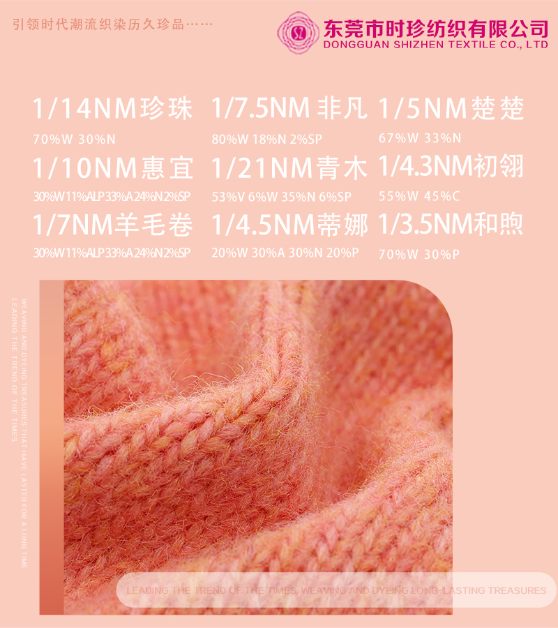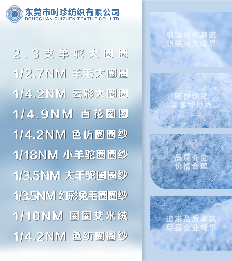 主营:6支、3.5支、2.1支彩虹纱、50支包芯纱、28支48支兔绒包芯、膨体澳毛、抗起球纤绒纱、5个6个8个10个20个50个羊毛混纺、纯羊毛、五五毛、1870拉架、24支人丝双曲、15支曲珠、30支丝光棉、52支滑线仔、色纺14支磨毛、9支磨毛、5.5支喷毛、14支筒子起毛、绞纱、14支黑芯仿兔、15支浅花灰羊驼马海筒子、绞纱。4.5支雪花马海、183包芯、5.5支人造、9支人造、14支白胚磨毛筒子、9支花兔绒花灰、沙土、白胚。3支冰岛、毛腈、前腈、3.6支、5.5支色纺喷毛