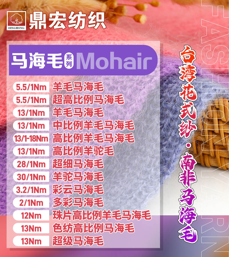 9S/1 13S/1 羊毛马海毛、1/13NM 超柔羊毛马海毛、1/13S 弹力羊毛马海毛、1/13NM 中比例马海毛、1/14NM 超柔弹力小马海、1/2NM 羊驼毛密圈圈纱、1/11NM 羊驼毛密圈圈纱、1/4.5NM 羊毛密圈圈纱、1/14NM 高比例羊毛密圈圈纱、1/14NM 羊毛密圈圈纱、1/5NM 羊毛雪花绒、1/18NM 羊驼毛密圈圈纱、