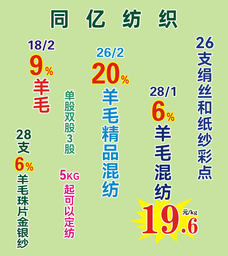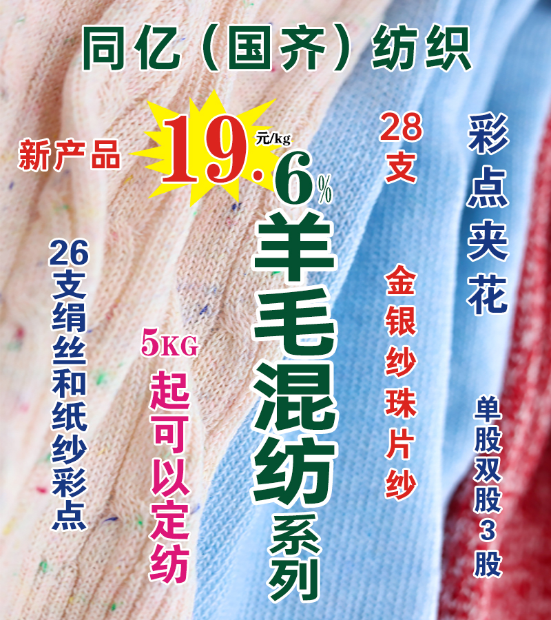 专业胚线。9支、 13支、 14 支、 15 支、 16 支 、18支、 20支弹力么唏,弹力起毛纱,15支黄金闪光弹力毛,15支白银闪光弹力毛,15支弹力羊毛胚纱,15支弹力兔毛么唏,14支弹力色纺么唏,15支弹力AB齐彩兔毛,16支精纺弹力包芯纱、弹力彩点么唏、马海毛、有色冰曲。