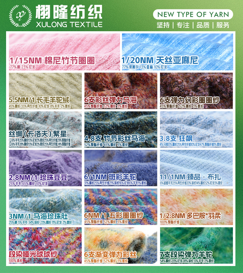 6支彩丝弹力马海、6支弹力幻彩圈圈纱、26/1NM亮丽天鹅绒、12针哑光雪尼尔、40NM/1超爽棉、6支10支15支米卡绒/雪尼尔、18NM/1柔软小尼绒