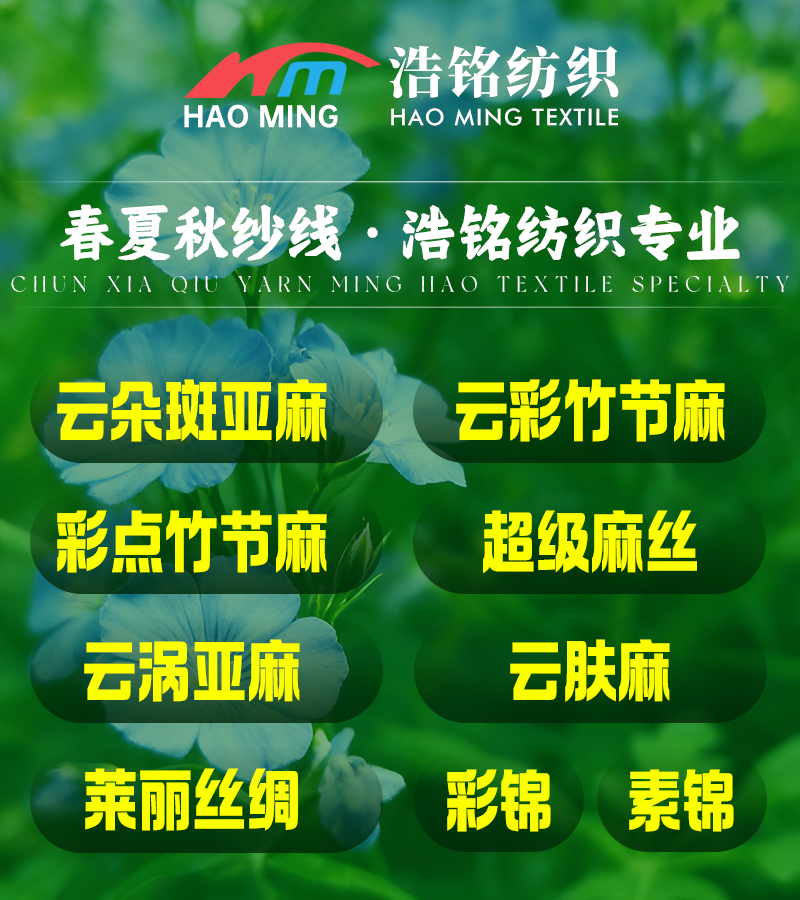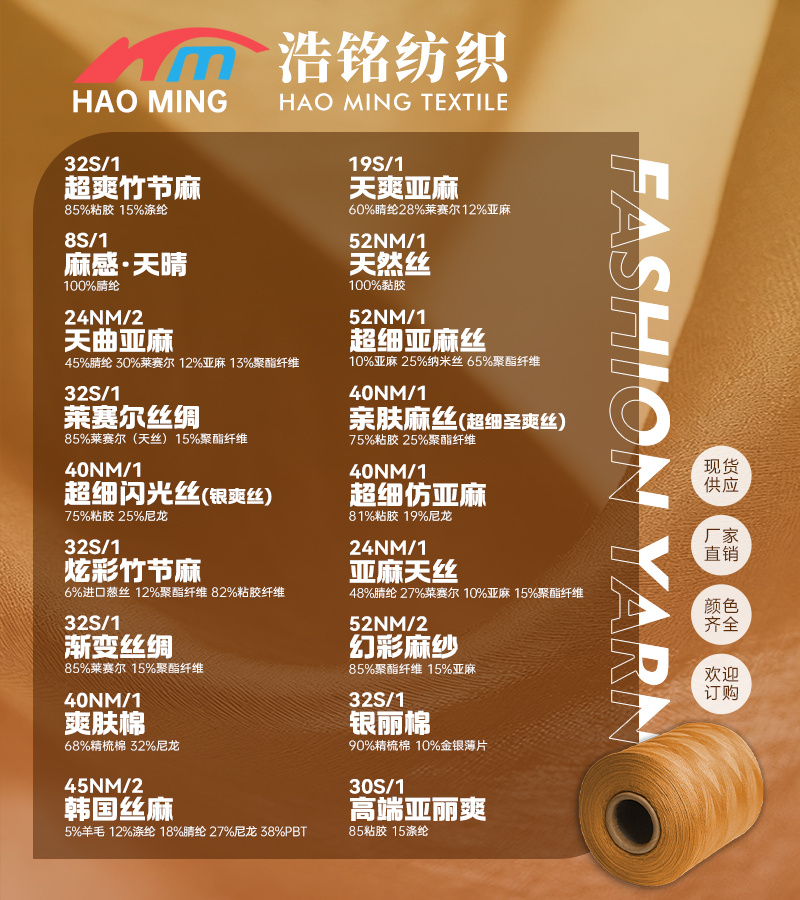 32/1 超爽竹节麻、1/40NM 超细圣爽丝 (亲肤麻丝)、1/19Nm天爽亚麻、1/24Nm亚麻天丝、52S/1 超细亚麻丝、32S/1 莱赛尔丝绸、1/40NM 超细闪光丝 (银爽丝)