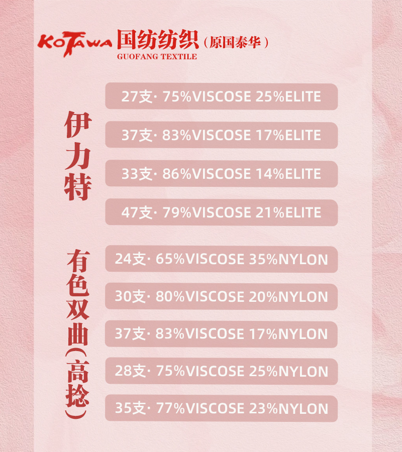 24NM/1无光(有光)双曲、28NM/1无光双曲、30NM/1无光(有光)双曲、24NM/1仿亚麻、24NM/1冰丝