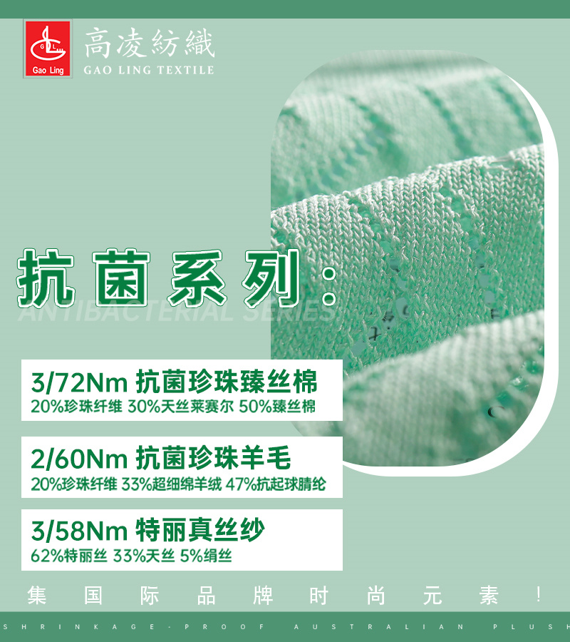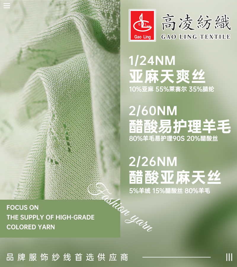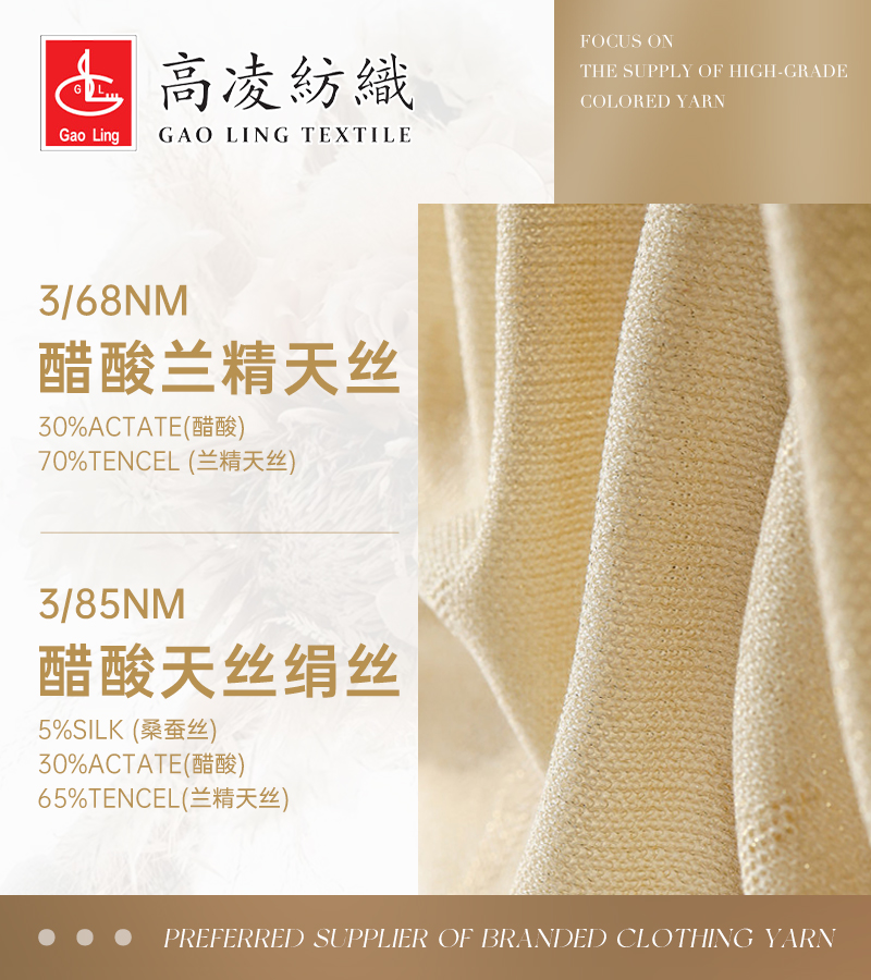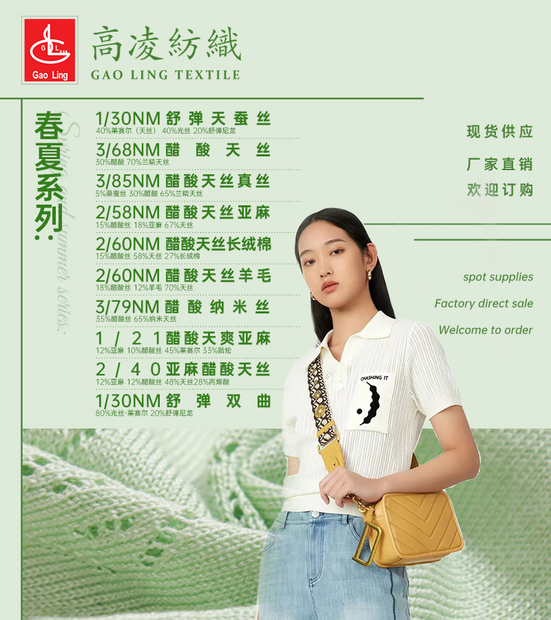 3/68NM 醋酸天丝、2/60NM 12%丝光羊毛 18%醋酸丝70%天丝、3/85NM 醋酸天丝绢丝、2/60NM 醋酸天丝棉、2/58NM 醋酸天丝亚麻、3/57NM 柔滑天丝绒、3/79NM 醋酸纳米丝、3/58NM 特丽真丝纱、3/52NM 防缩澳毛绒、2/32NM 澳毛绒、2/60NM 抗菌珍珠羊毛、3/60NM 玉蚕丝羊毛、2/28NM 玉蚕丝羊绒