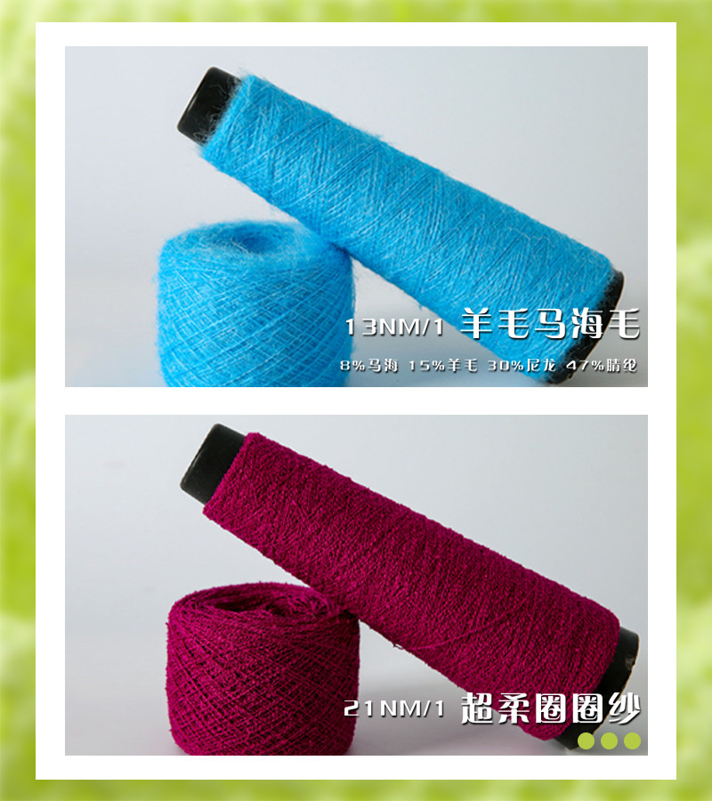 桑蚕丝、天丝、羊毛混纺纱、圈圈纱、马海毛、花式纱