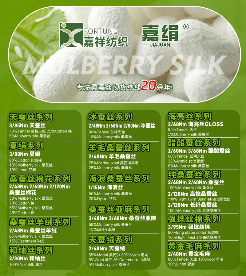 天蚕丝系列、冰蚕丝系列、绢丝系列、夏绢系列、羊毛绢丝系列、绢丝棉花系列、海浪绢丝系列、天蚕绒系列、绢丝羊绒系列、绢丝亚麻系列