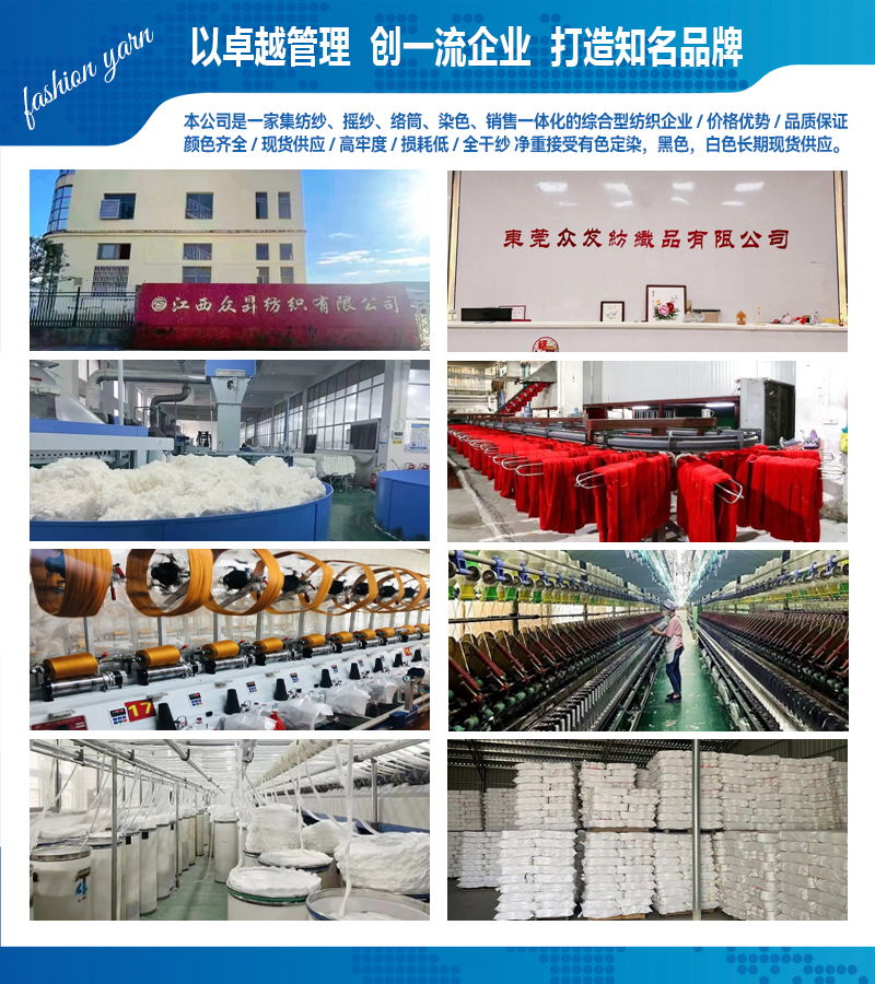 自设纺厂.染厂.一体化生产,产业链仓储式销售服务. 胚纱大量现货供应。接受有色定染,黑色,白色长期现货供应(专属批号H206)28/2高弹包芯纱)