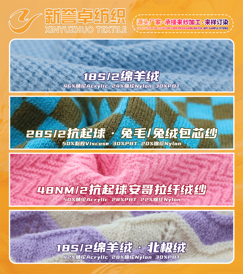 28S/2高弹包芯纱、28S/2仿兔包芯纱、18S/2抗起球北极绒、28S/2仿安哥拉、28S/2三合一、52S/2天丝腈、50S/2真丝棉、26S针贝绒、36S/45S羊毛包芯纱、48S/2天丝麻、28S/2安迪绒、1.3cm2.0cm仿貂、1.3半边绒