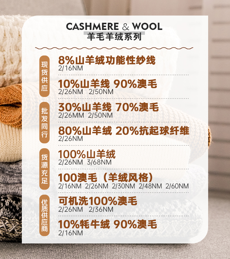 山羊绒功能性纱线、10%山羊绒、30%山羊线、80%山羊绒、100%山羊绒、100%澳毛(羊绒风格)、可机洗100%澳毛、10%牦牛绒、本司所有产品现货供应·工厂批发