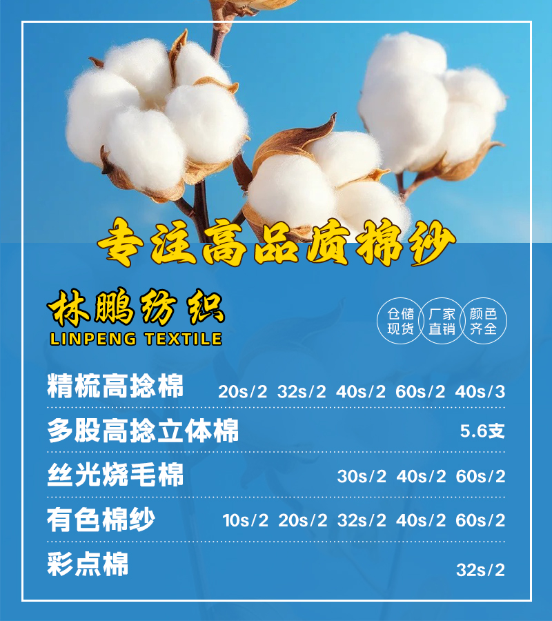 精梳高捻棉、5.6支多股高捻立体棉、丝光烧毛棉、有色棉纱、32s/2彩点棉
